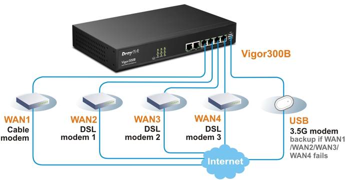 DrayTek Vigor 300B serisi yüksek performanslı 4 adet WAN portu arasında Load Balance yapabilen güçlü bir router ailesidir. 4 adet GigaBit WAN Portu 2 adet Gigabit LAN Portu, 2 adet USB Portu ve 1 adet Konsol Portu bulunan bulunan Load Balance yönlendiricidir. IPv4 ve IPv6 aynı anda uyumlu olan cihazın Gigabit WAN portlarına takılabilen BroadBand (Genişbant) bağlantılar aynı anda Load Balance yöntemi ile tek bir bağlantı gibi kullanılabilmektedir.