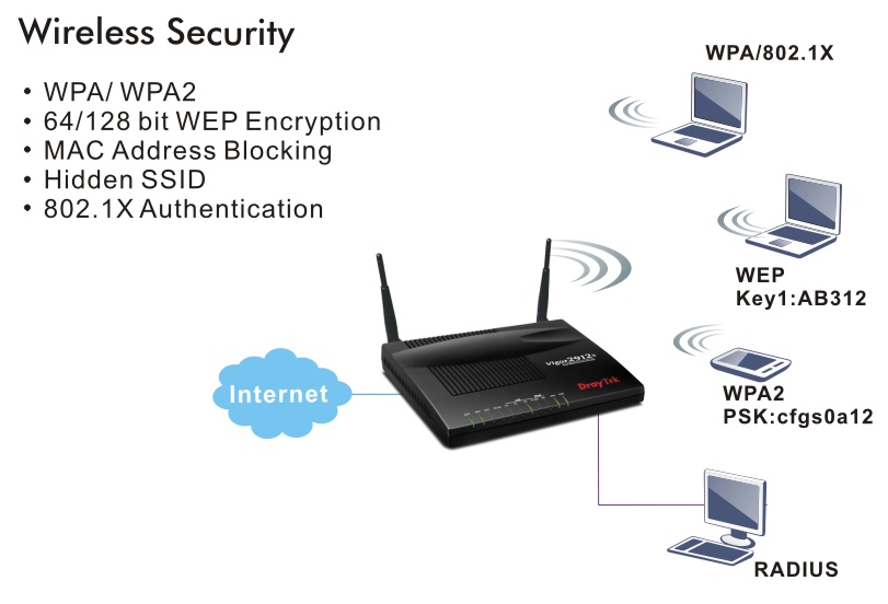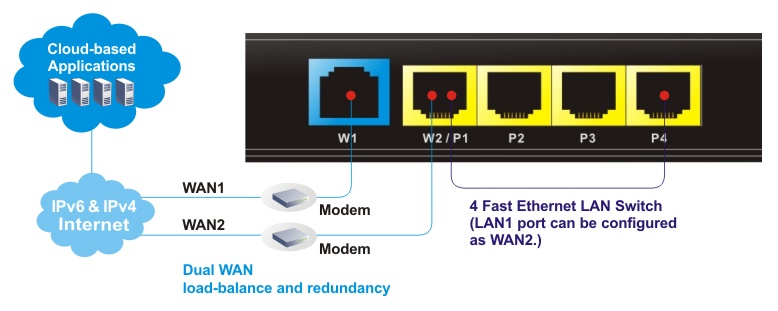 Vigor 2912 iki Ethernet WAN’ı olan bir yönlendiricidir. 1 x 10/100 Base-TX WAN, RJ45, P1 Ayarlanabilir WAN2, WAN portları arasında yük dengeleme ve yedekleme yapılabilir. 16 adet VPN Tünel sonlandırabilir. USB portundan USB 3G Modem ile WAN bağlantıları GSM şebekesinden yedeklenebilir. 4 adet Fast ethernet LAN Portu mevcuttur. USB Print Server Desteği mevcuttur.