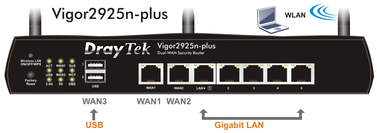 Vigor 2925 Serisi iki Gigabit Ethernet WAN’ı olan bir yönlendiricidir. IPv6 ve IPv4 standartlarına uygundur. WAN portları arasında yük dengeleme ve yedekleme yapılabilir. 50 adet VPN Tünel sonlandırabilir (25 SSL VPN Seçefneği). 2 adet USB portundan USB 3G Modem ile WAN bağlantıları GSM şebekesinden yedeklenebilir, Print Server ve FTP Server olarak kullanılabilir. 5 adet GigaBit Ethernet LAN Portu mevcuttur.