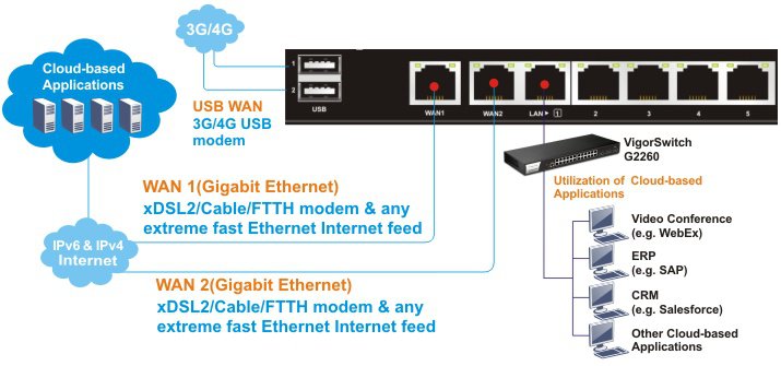 - Yük devretme ve yük dengeleme için çift Gigabit Ethernet WAN portu