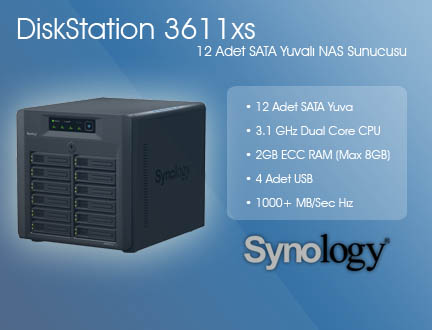 Büyük Ölçekli İşletmeler için 1000+ MB/Sec hızları ile Çok Yüksek Performanslı 12 adet SATA Yuvalı NAS Sunucusu. 3.1GHz Dual Core CPU, 2GB ECC RAM(8GB kadar yükseltilebilir), 12 adet Internal 3,5" SATAII veya 2,5" SATA/SSD HDD Yuvası, 4 adet USB, 2 adet Expansion Port, Maksimum 50 adet IP Kamera Desteği, 4 adet Link Aggr. destekli Giga Eth. veya 2 adet 10Giga Eth. veya 4 adet Giga Eth. Kartı, FTP, Kriptolanmış Ağ Yedekleme, EXT3 desteği, Harici Disk için FAT, NTFS desteği, maksimum 4096 adet kullanıcı ve 512 adet kullanıcı grubu tanımı, 512 adet paylaşım klasörü, 1024 adet aynı anda bağlantı, maksimum 2 adet yazıcı paylaşım desteği. Türkçe kolay web arayüzü. Windows ADS ve DataReplicator desteği. Domain kullanıcıları Samba/AFP/FTP ile girebilir. JBOD, Raid 0/1/5/5+Spare/6/10 desteği. Synology DX1211 ile kapasite artırma desteği. iSCSI (LUN/Target) Desteği.