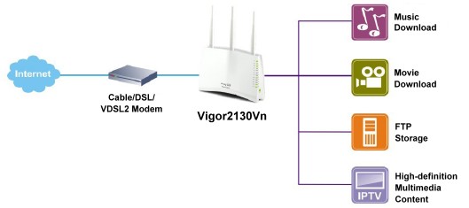 Vigor 2130Vn High Speed Wireless Gigabit Router Yüksek güçlü yeni nesil entegre genişbant Gigabit Wireless yönlendiricidir. ADSL, G.SHDSL, VDSL2, Metro Ethernet, FTTB, FTTH gibi bağlantılar için modeminizin arkasına bağlayabilirsiniz. 4 adet 1000Mbps lik ethernet portu mevcuttur. USB 3G Modem, FTP ve Print server desteği mevcuttur.802.11n Desteği mevcuttur