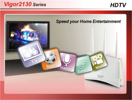 With the development of NGN (Next Generation Network), you may recently hear the news about FTTx deployment in your local area or even have already subscribed the unbundling last mile service (e.g. VDSL2) from local ITSP for FTTx. As adopting FTTx, the main question for end users is whether your legacy router could fully utilize its bandwidth or not. For example, you purchase a 120Mbps internet connection from your ISP, but your existing router can't support 90Mbps throughput. That's why DrayTek launches Vigor2130 series - High Speed Gigabit Router, perfectly complied with VDSL2 environment including Vigor2130, Vigor2130n and Vigor2130Vn for speed-wanted customer. With high throughput performance and secured broadband connectivity provided by Vigor2130 series, you can simultaneously engage these bandwidth-intensive applications, such as high-definition video streaming, online gaming, and Internet telephony/access.