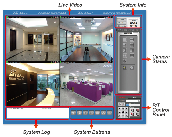 CamPro Express 64, kullanıcıların aynı anda bir çok görüntüyü izlemesine ve kayıt altına lamasına imkan veren bir izleme/takip yazılımıdır. Desteklenen çok sayıda kameranın aynı anda kullanımı ile, kullanıcı, farklı ortamlara göre özelleştirilebilen takip ve güvenlik sistemini kolaylıkla uygulayabilir. POE-260HD ayrıca, AirLive'ın akıllı video takip/kayıt yazılımı CamPro Professional'ı da desteklemektedir. intelligent video surveillance recording software. Daha detaylı ihtiyaçlara cevap vermesi için tasarlanan CamPro Professional, fonksiyon analizleri, ısı dedektörü seçenekler ile, kullanıcıların stabil ve etkin takip sistemleri kurmasına imkan verir. surveillance system.
