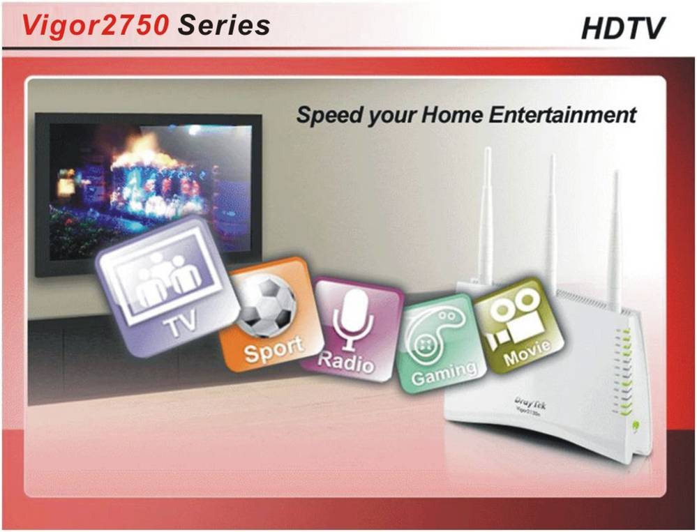 The Vigor2750 series are for Very-high-speed digital subscriber line 2 (VDSL2) infrastructure, the cost efficient choice for upgrading existing xDSL-infrastructure when operators and carriers deploy FTTx for Next Generation Network (NGN). Vigor2750 series have one VDSL2 WAN interface and 4 Gigabit LAN switch to ensure data and voice packets transmission to client side devices for bandwidth-intensive applications, such as high-definition video streaming, online gaming, and Internet telephony/access. In addition, Vigor2750 series are future proof devices compliant with official IPv6 (Internet Protocol version 6) ready certified. With IPv6 ready certified, users don’t need to worry about running out addresses of current IPv4 due to rapid usage growth of mail server, FTP server, web server, ERP, CSM, surveillance or unified communication for business side and triple play or home automation for home/SOHO side.