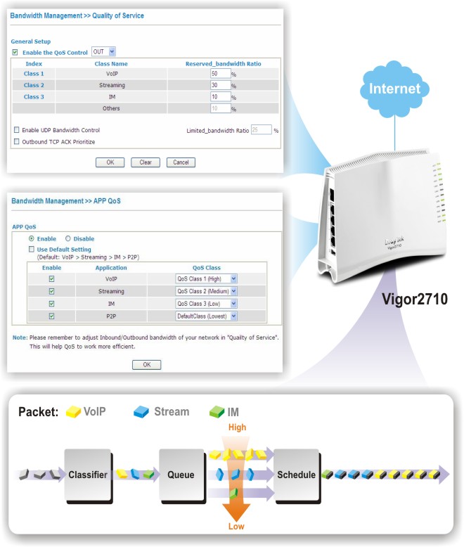 Internet telefon servisi ile kombine çalışan Vigor 2710Vn, UMTH operatörlerinin VoIP telefon görüşme servislerini kullanarak, ister sabit telefonları ister mobil telefonları arayabilirsiniz. ADSL hattınızı telefon hattı olarak kullanmanızı sağlayarak telefon maliyetlerinizde büyük tasarruflar sağlar. Eğer görüşme esnasında internet bağlantısı gider ise sistem otomatik olarak geleneksel telekom hatları üzerinden sizi görüştüğünüz noktaya bağlar. Vigor 2710Vn elektrikler kesildiğinde bile harici görüşmelerin devamını sağlar.