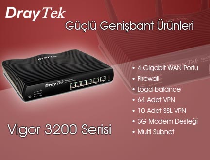 DrayTek Vigor 3200n Broadband Router 4 adet GigaBit WAN Portu bulunan Load Balance yönlendirici. 64 adet VPN ve 10 adet SSL VPN Tünel sonlandırabilir. (400Mbps Performans) USB portundan USB 3G Modem ile WAN bağlantıları GSM şebekesinden yedeklenebilir. Obje tabanlı güçlü firewall özellikleri.